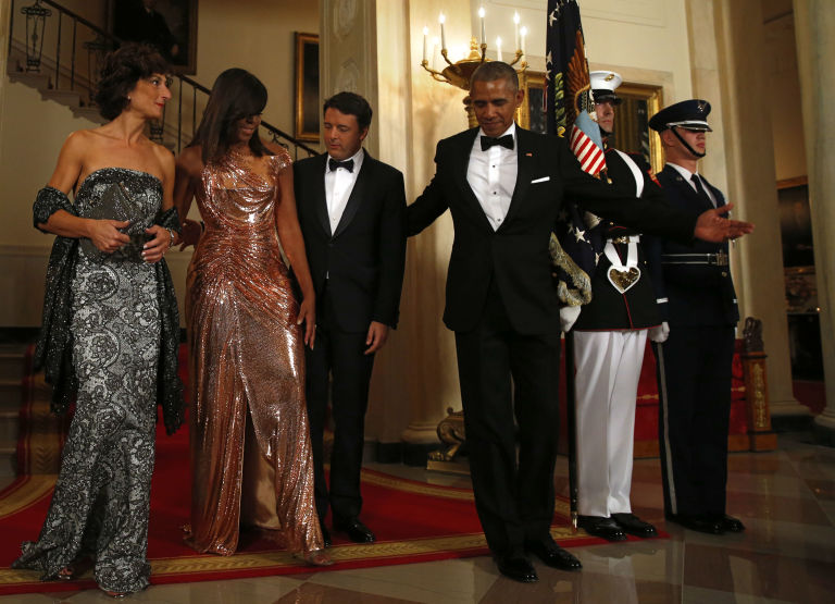 The shiny rose-gold number features an irregular neck-line and covered information at the bodice. Even her sorted hair contributes a smooth sizing to the look. Plus, Chief executive Obama enhances her well in his sharp tux.